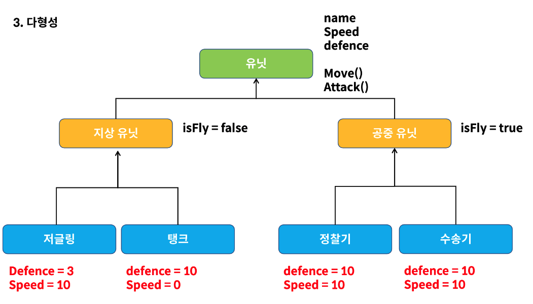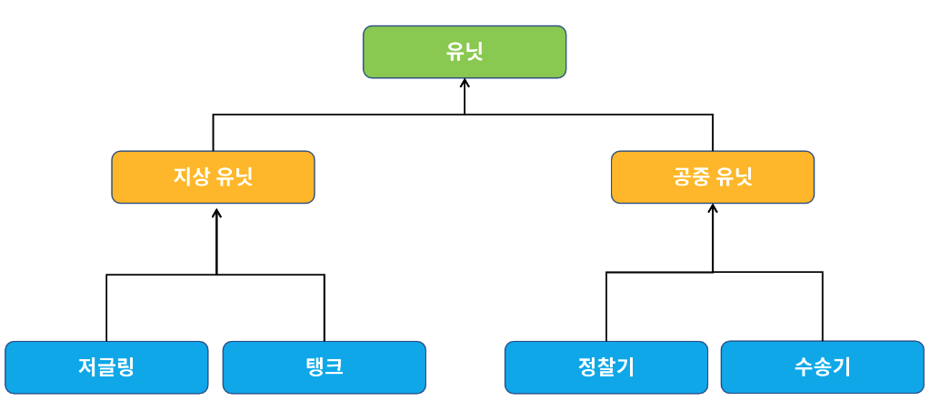 위의 그림들을 보면 알 수 있듯이 모든 유닛들 (저글링, 시즈탱크, 레이스...) 은 모듀 Unit이라는 공통 인터페이스를 구현하기 때문에 하나의 타입으로 다양한 유닛들이 생성됌. 그리고 각 Unit 별 move 메서드에 매개 값들을 다르게 하여 각각의 기능들 또한 다양하게 구현할 수 있다.