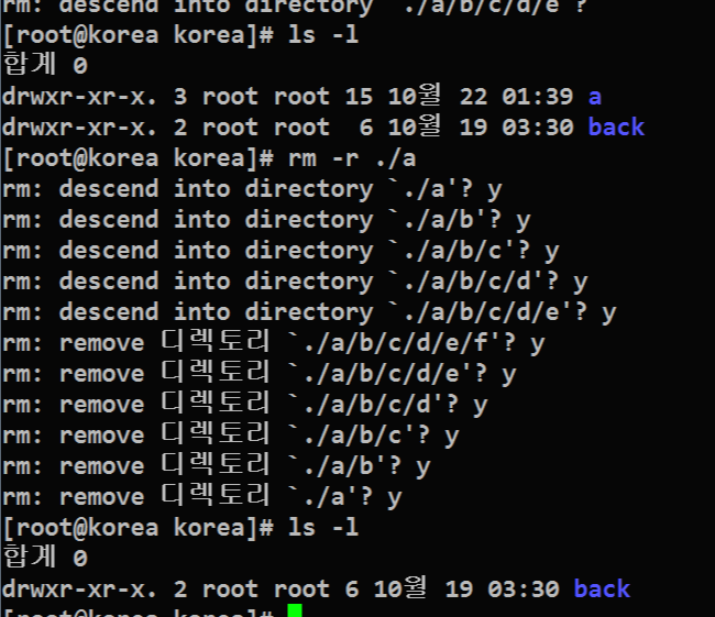 디렉토리 삭제는 rm -r 옵션을 사용해야한다.