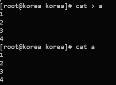 아래 예시 : cat > a --> a라는 파일에 1,2,3,4 를 cat을 이용해서 내용추가하기
