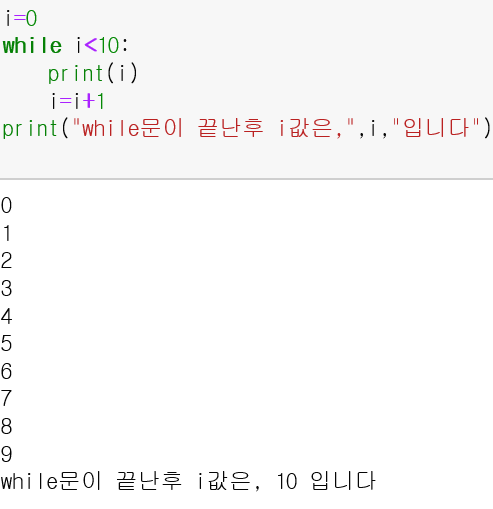 순환문 while / for 문도 , 조건문과 마찬가지로 : 콜론을 붙혀주어야한다.