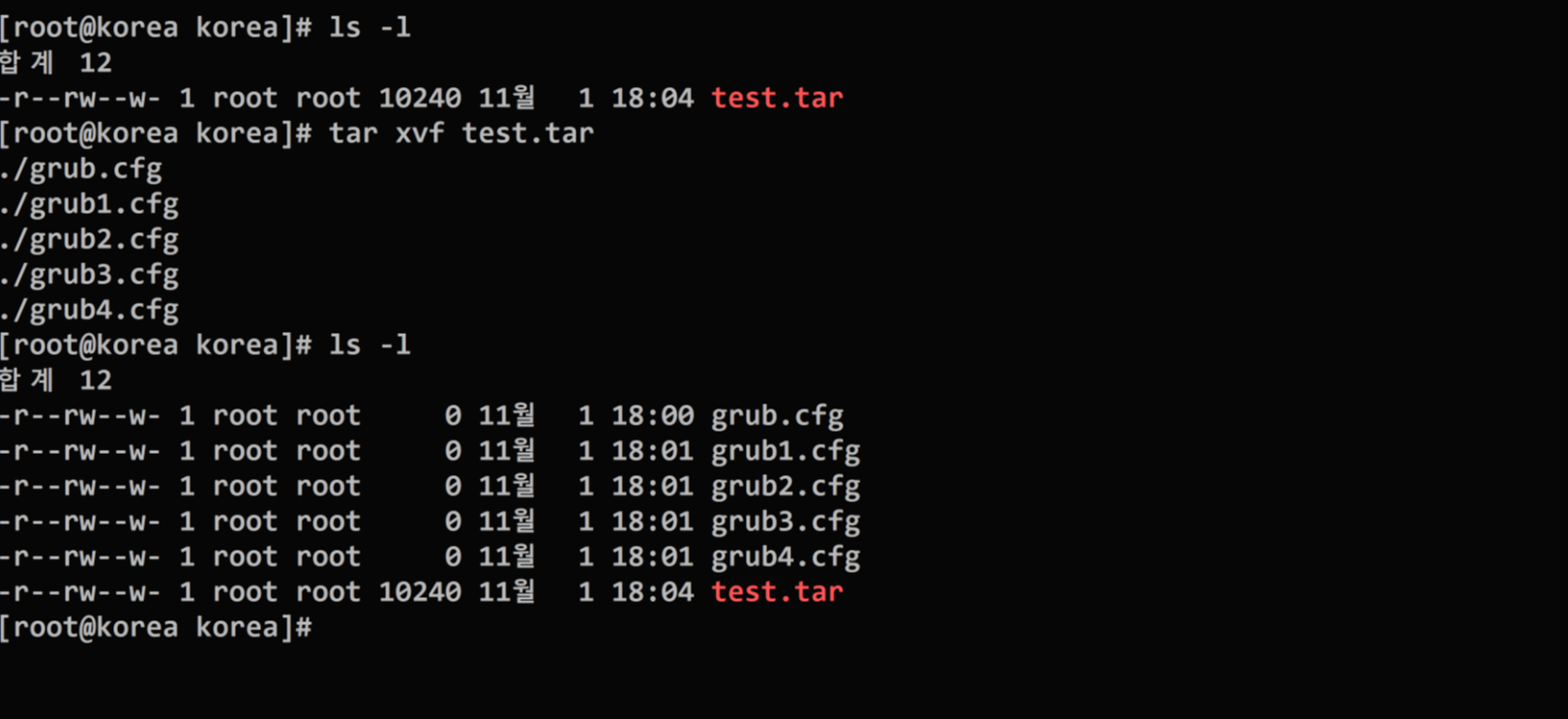그럼 이제 tar 를 푸는것은 옵션만 바꿔주면 된다. 아래와같다. 여기서 쓰이는 옵션 xvf 에서 x 는 풀기라는 뜻이며, 나머지옵션은 위의 압축과 같이 압축/풀이과정을 보여주는 옵션들이다. 결과는 아래와 같다.