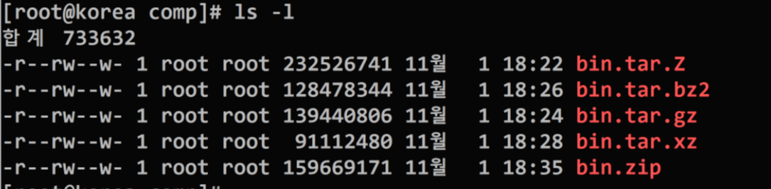 그렇다면 /bin/* 경로내의 데이터들을 각 압축방법을 이용해서 /comp디렉토리생성후, /comp/* 내의 경로로 압축해본후, 각 압축방법의 압축률을 비교해서 압축률이 높은순으로 나열해보자.