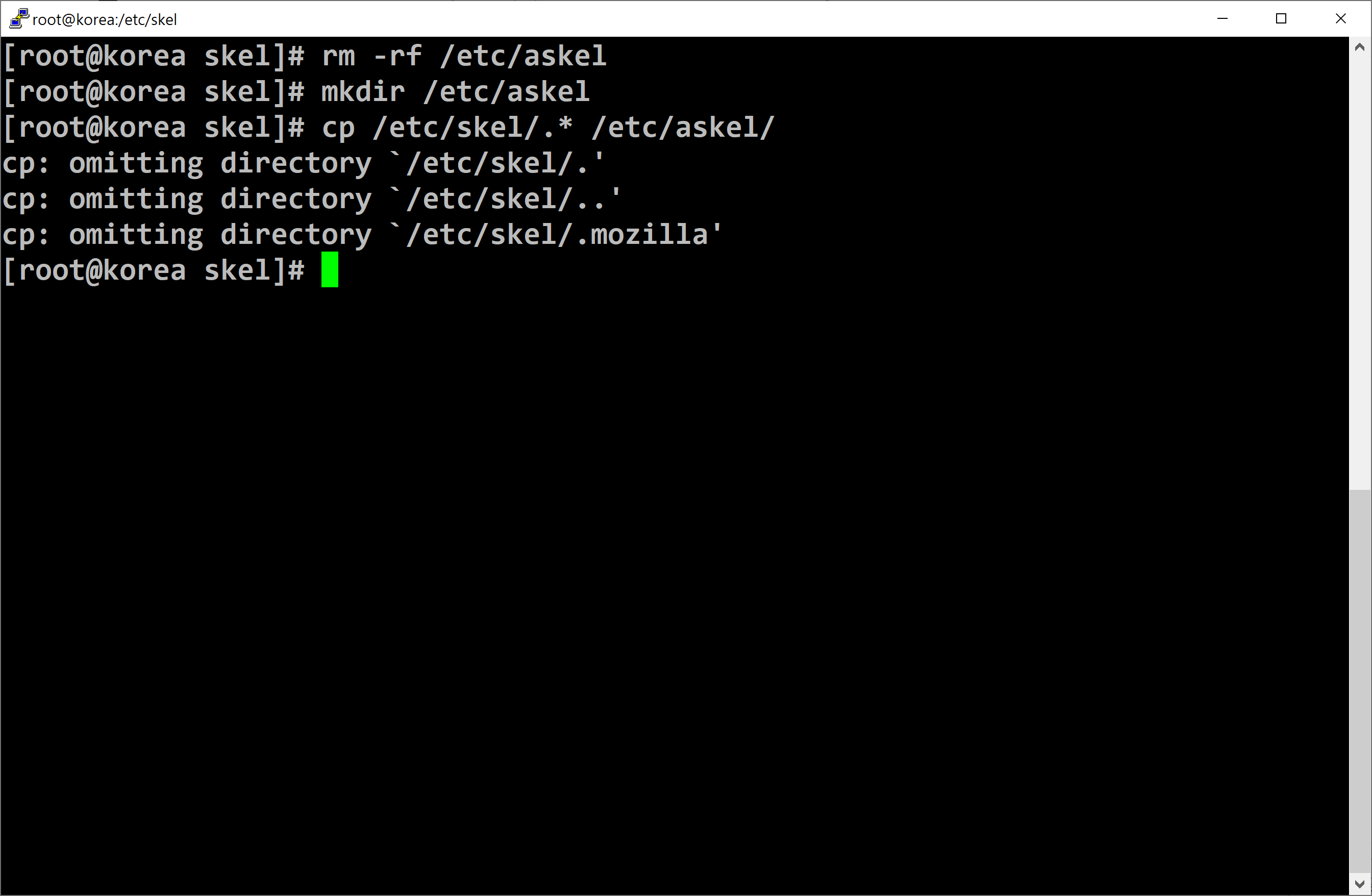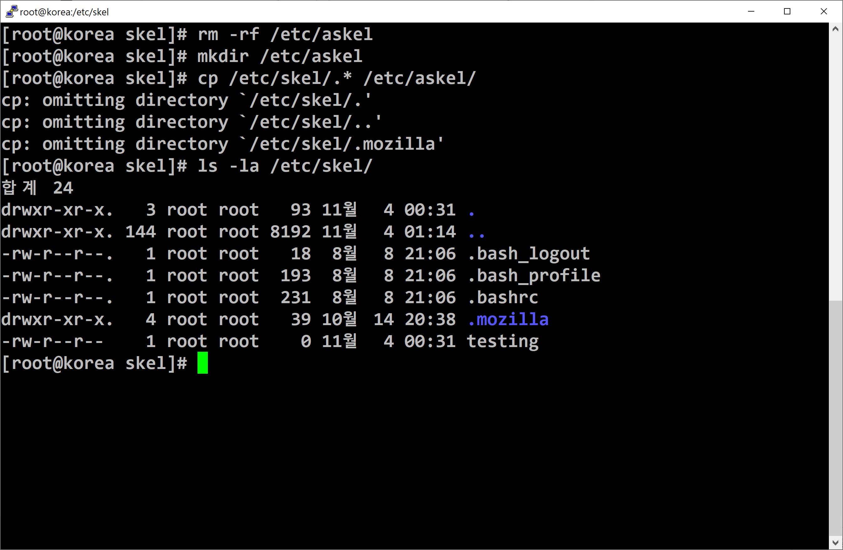 그런데 여기서 실질적으로 /etc/skel 내에 존재하는 디렉토리는 .mozilla 하나이므로, 이 디렉토리만 cp -r 옵션을 적용하여 옮겨주면 작업 끝이다.