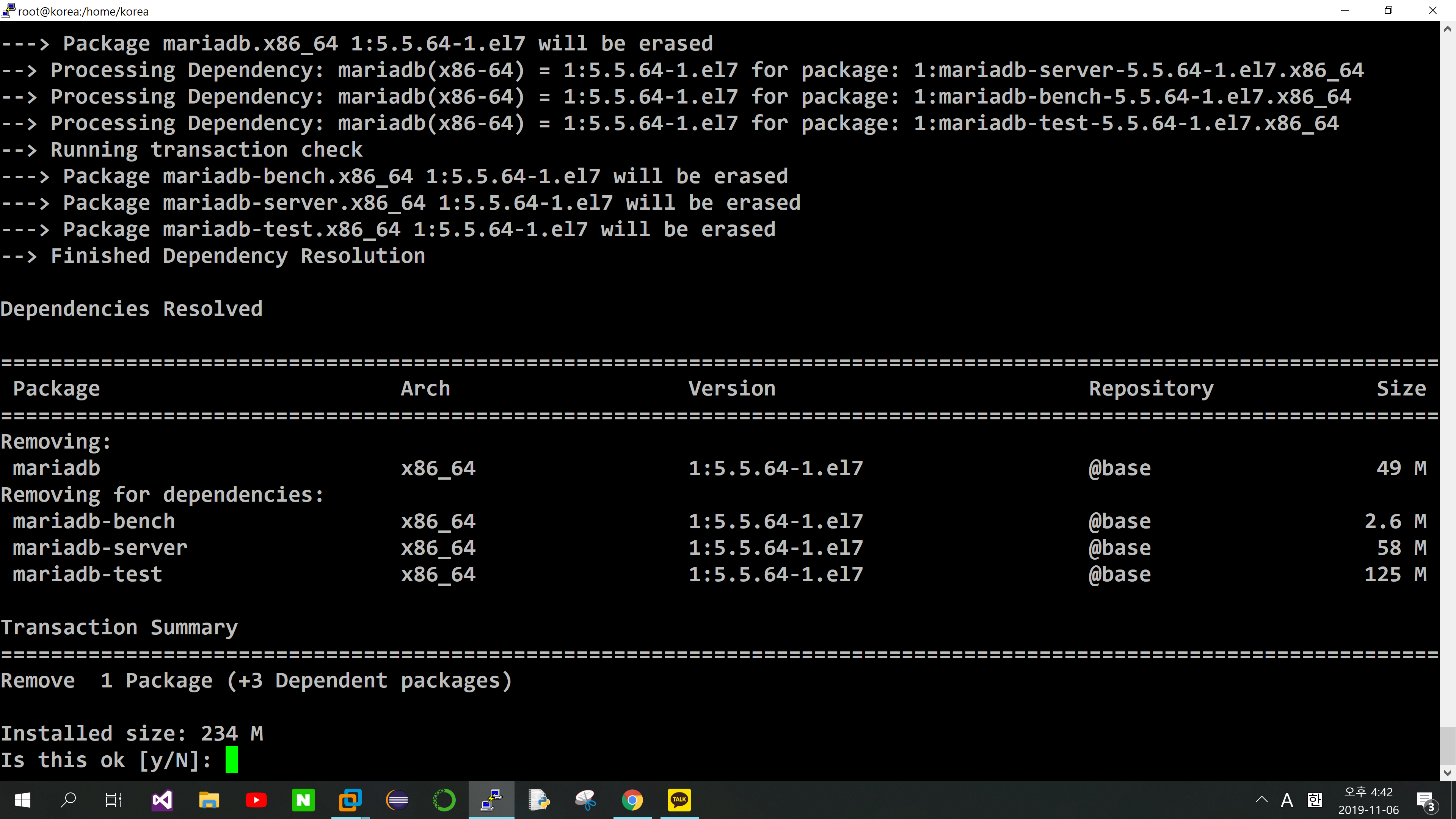 설치했을떄와 같이 , -y(yes) 옵션을 붙히던지 해서 좀전에 설치한 mariadb* 패키지로 전부 삭제해본다면,