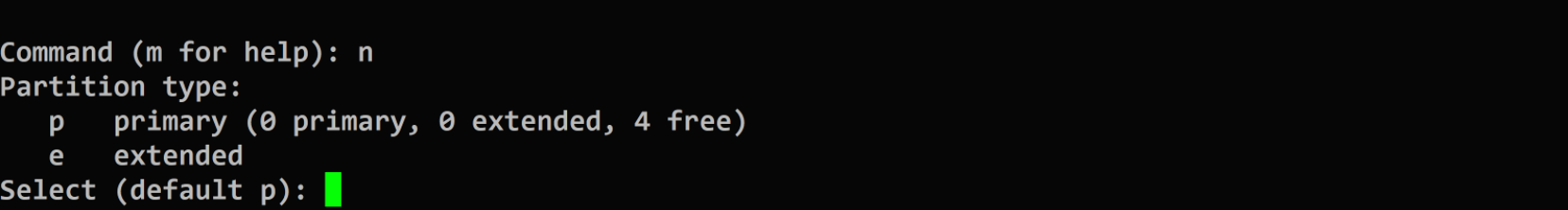 아래와같이 n옵션으로 새 파티션 생성시, 현재 아무것도 없는 0,0,0 구조이므로, extended 가 0이므로 logical 파티션은 생성하지못해서 뜨지않는 상태이다.