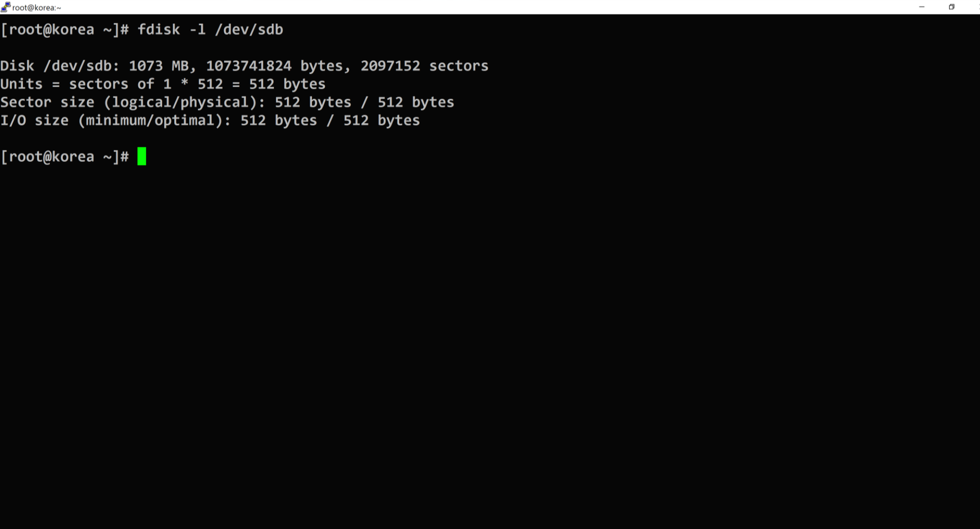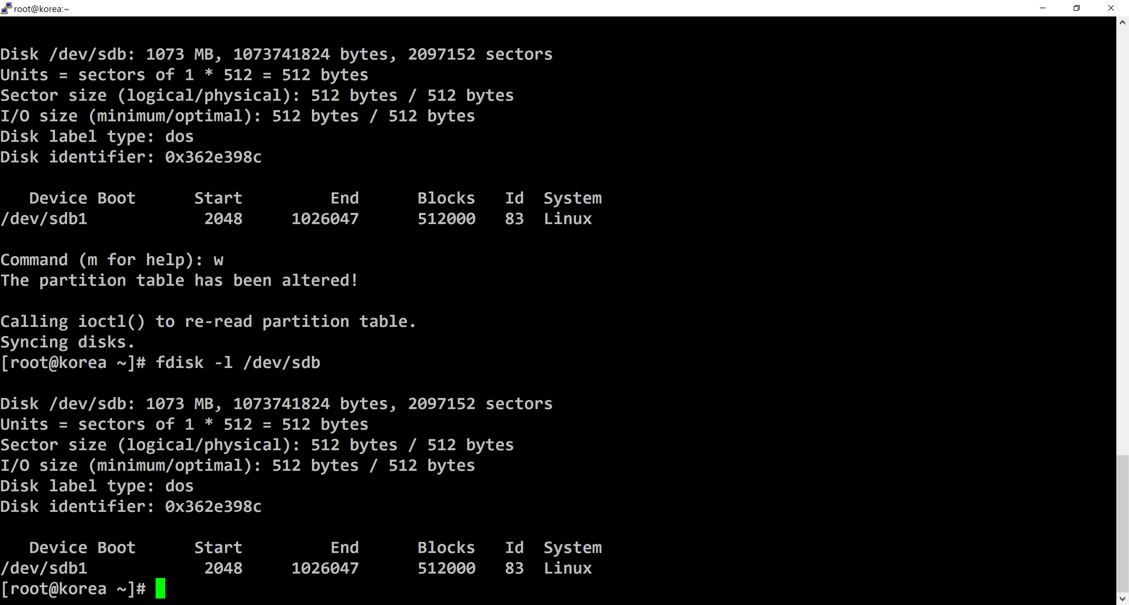 아래는 새로만든 1GB 하드디스크에 sdb 영역에 500M 용량의 파티션을 만들어본 결과이다 .
