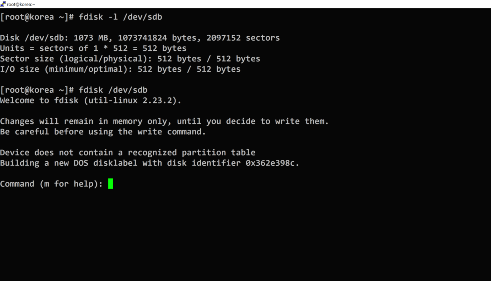 fdisk [내가만든디스크] 명령어로 아래와 같이 파티션 구성창으로 접속해보기.