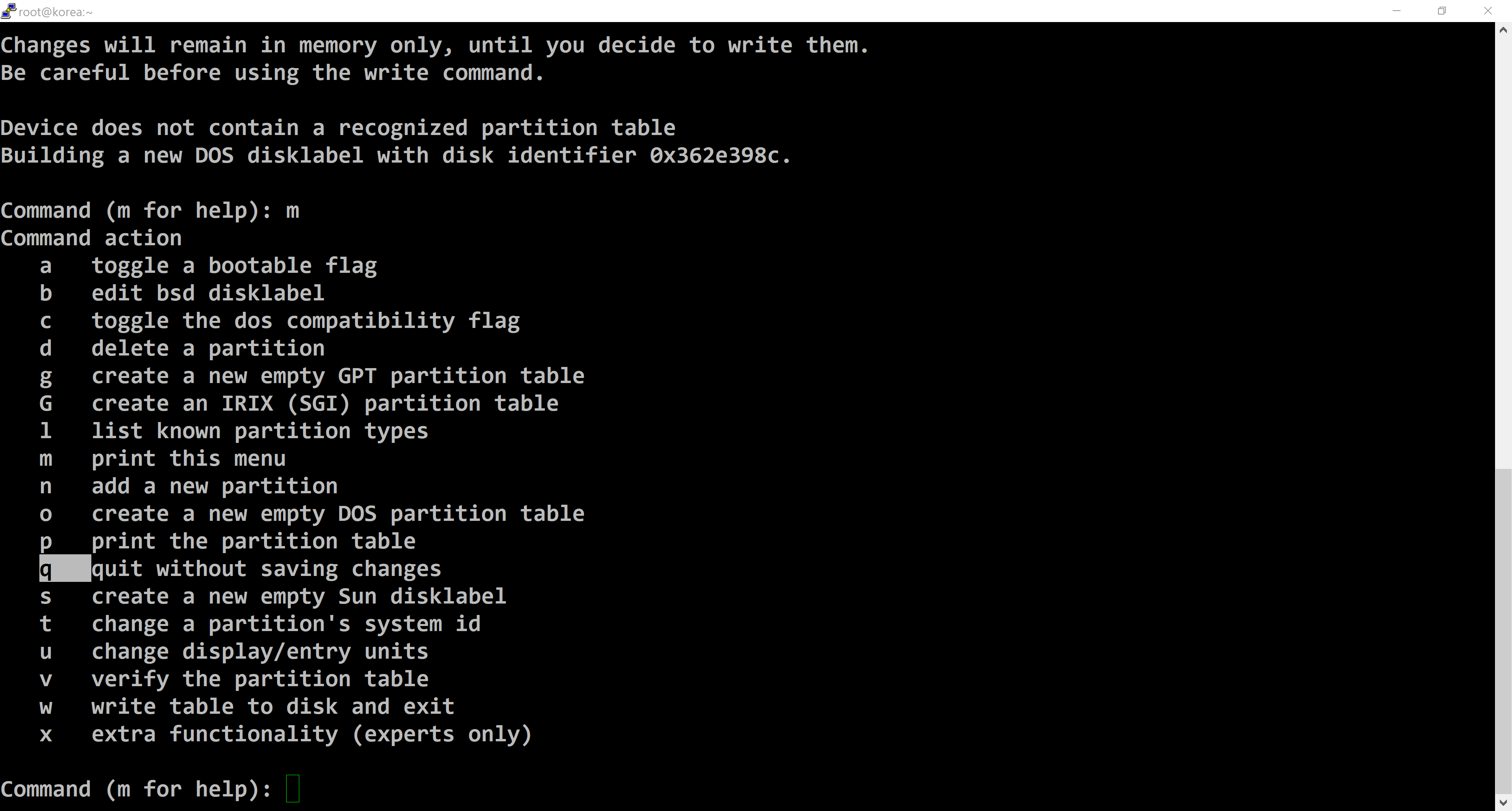 주요 파티션 옵션들 : d , n , p , q , w 정도만 알아두자 . 설명만 읽어보면 모두 이해가능하다.