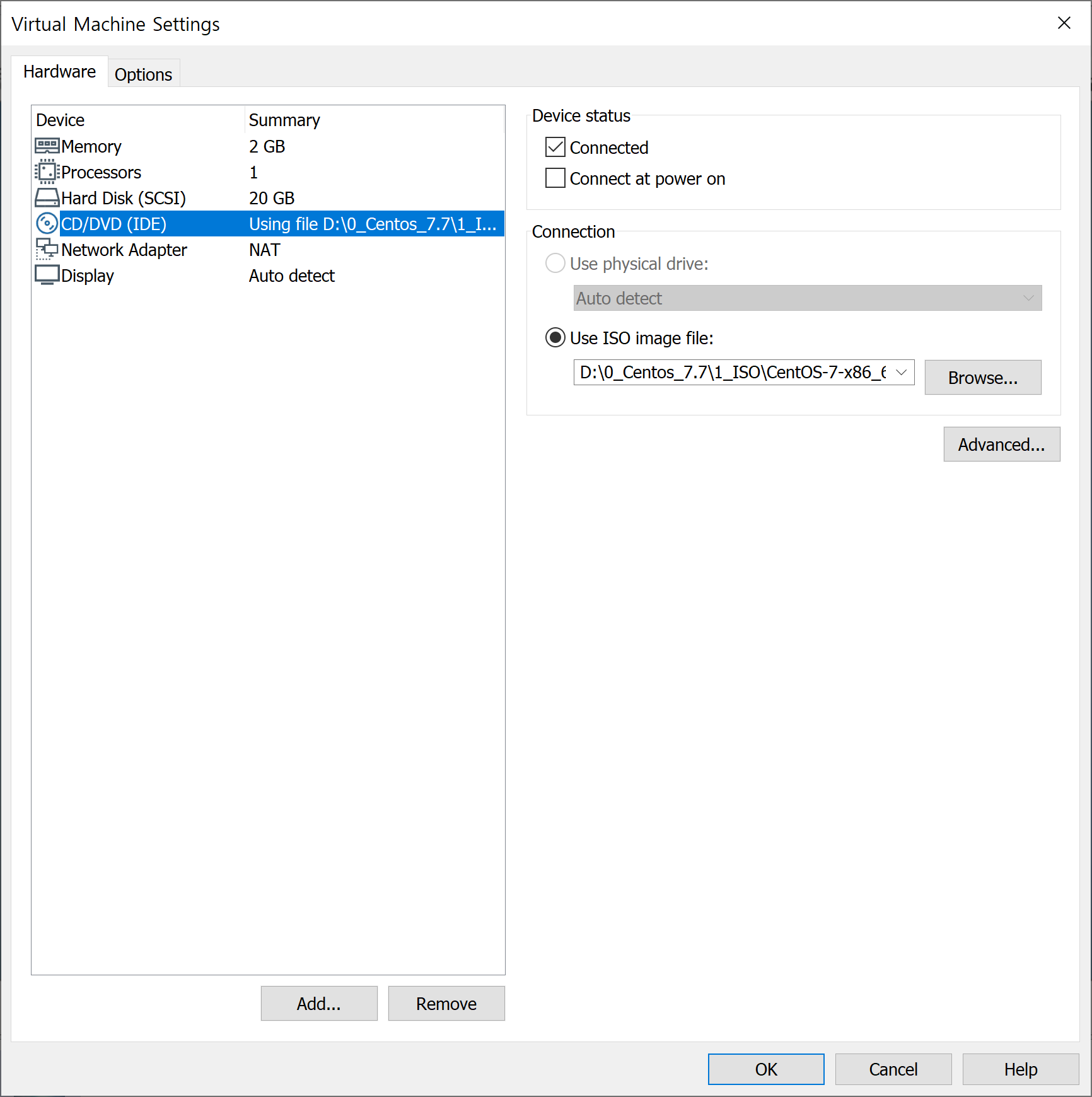 가상머신 setting 에서 CD/DVD 를 누르고, 본인의 iso 이미지파일을 정상적으로 넣어주고 위의 Device status 를 커넥트해주자.