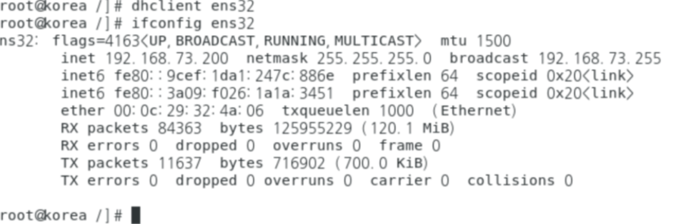 이후 ifconfig ens32 입력하여 , server에서 설정해준 네트워크대역으로 나눠받은것을 확인가능