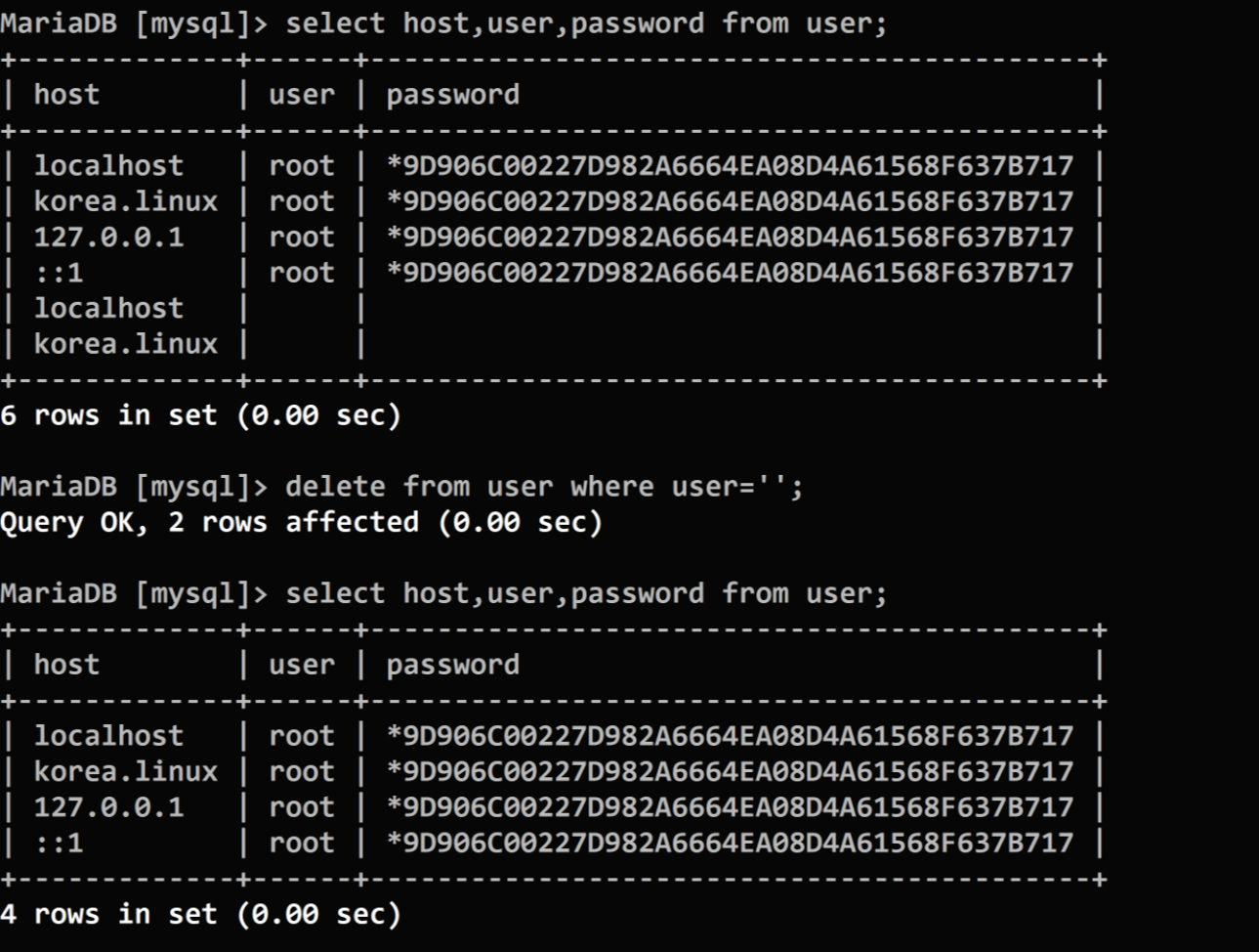 아래는 delete from user where user=''; --> user값이 0인 user 삭제하는 delete 명령어입력결과