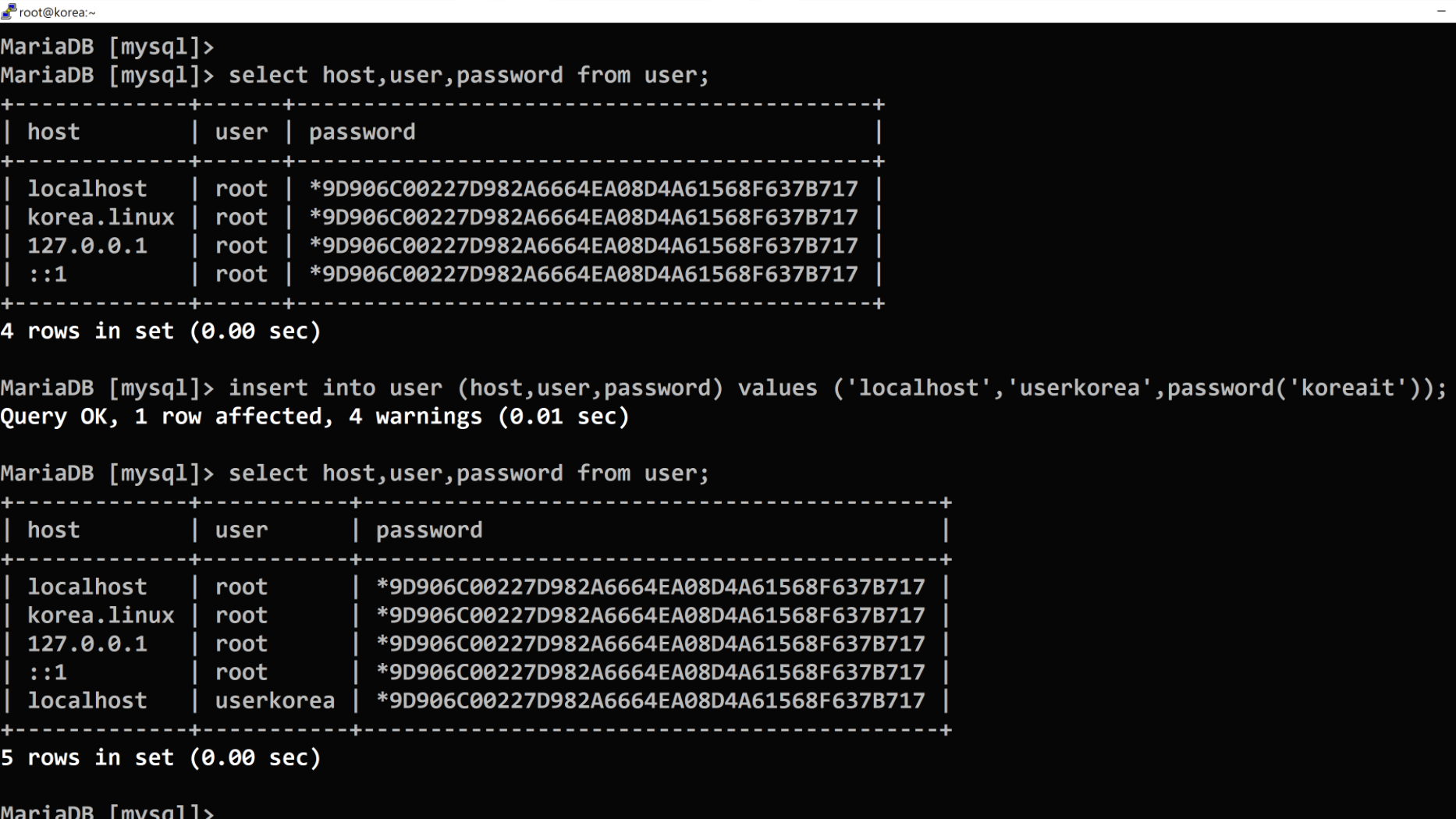사용자 생성 : insert into user (host,user,password) values ('localhost','userkorea',password('koreait'));