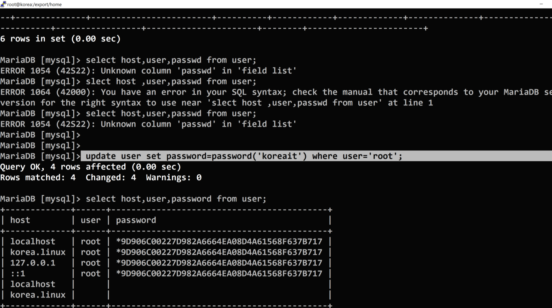 아래와 같이 update 명령어를 이용해서 비밀번호 수정후의 화면이다. 비밀번호가 암호화 되어있는것을 확인가능하다.