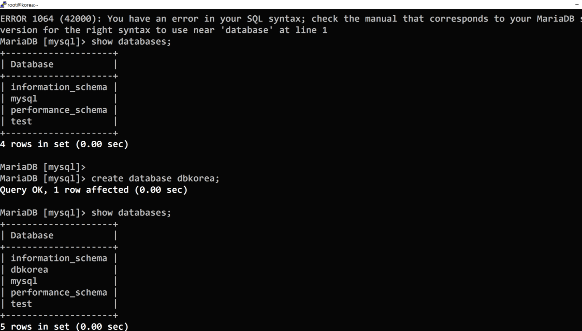 위와 같이 userkorea를 만들어보았다. 그렇다면 ,이 userkorea로 접속하여 dbkorea라는 연동된 데이터베이스를 만들어보아라 .