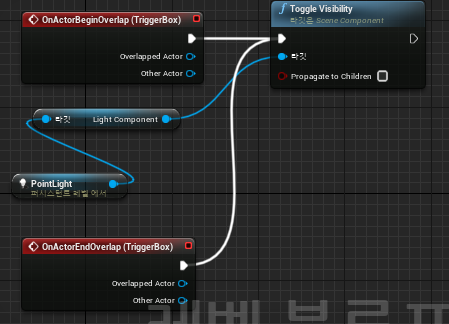 다시 블루프린트로 돌아와서, 콜리전 -> OnActorEndOverlap노드를 생성한후 Toggle Visibillity에 아래와 같이 연결한다.
