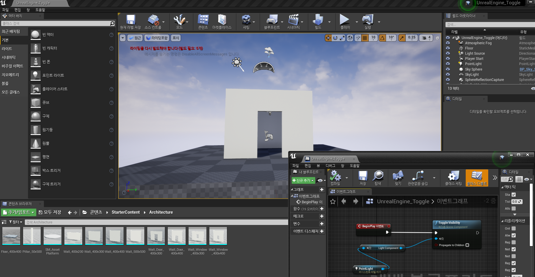 이후 플레이어가 방 안에 들어가면 액터가 ToggleVisibillity를 오버랩하여 불이 점등될것이다.