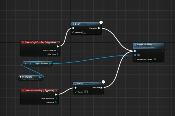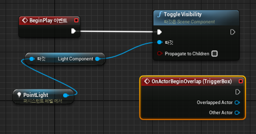 이후 더이상 게임시작과 동시에 점등이 아닌, 플레이어가 TriggerBox에 들어갈떄만 점등이 되야하기에, 아래와 같이 노드를 수정해준다.