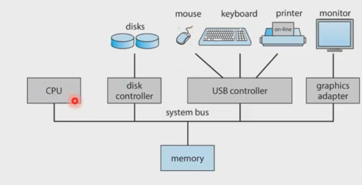 : One or more CPUs, device controllers connect through common bus providing access to shared memory