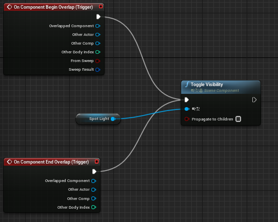 이후 아래와 같이 실행핀을 Toggle Visibillity에 연결하면, Trigger Box를 통해 라이트를 Toggle하는 기능이 완성된것이다.