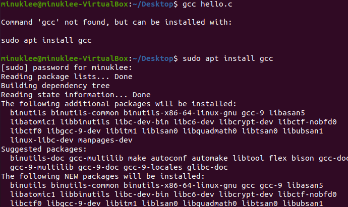 3. gcc hello.c 입력시 에러메세지 -> sudo apt intstall gcc를 입력하여 gcc 설치