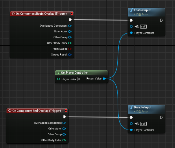 이후 아래와 같이 시작과 끝단에 Enable 액터를 연결해주고 플레이어 컨트롤러 액터를 각 액터에 연결해준다.