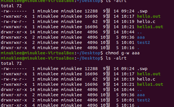 ex) chmod g-w aaa : aaa의 group에서 w(write) 권한을 - (뺸다) -> 이후 앞의 권한변경을 확인가능