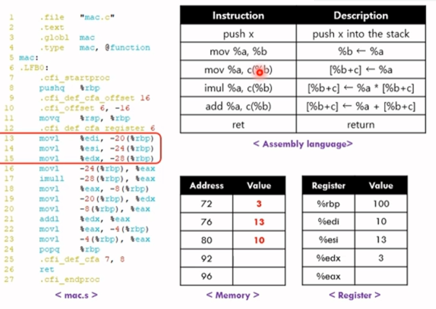 ->13번줄의 mov1 %edi, -20(%rbp) 는, rbp의 주소값인 100에서 20을 뺸 주소에 edi의 값인 10을 넣으라는 뜻이다.