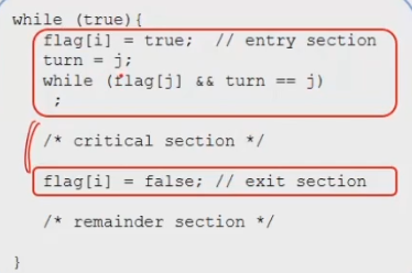 2. turn=j : 턴을 상대편에게 넘김. 3. 이후 아래 while문처럼 상대방이 들어가고싶은지(flag)와, 실제로 상대방 턴인지를 확인하고 맞으면, 계속 while을 돌림 4. 이후 critical section으로 접속