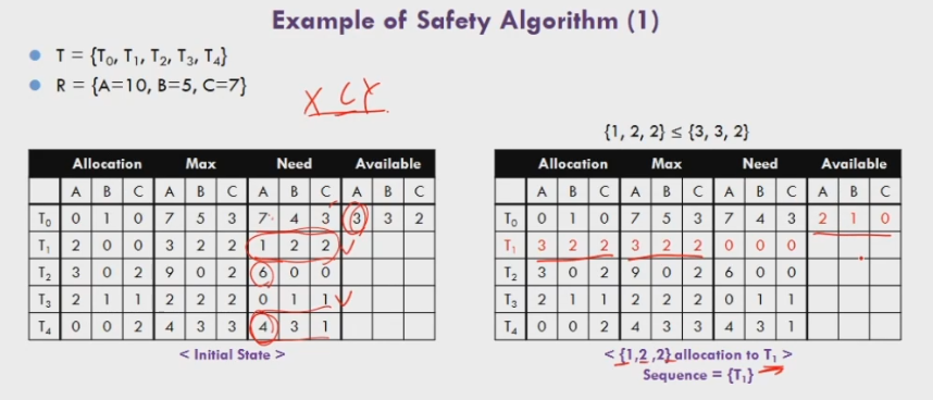이때 T0 은 가능한 갯수에서 max까지 못채워지므로 T1이 가능하므로 T1을 채워준다. -> 이후 T1은 종료 -> Available에 T1의 값을 반환해줌