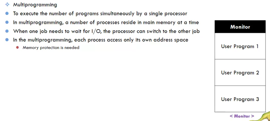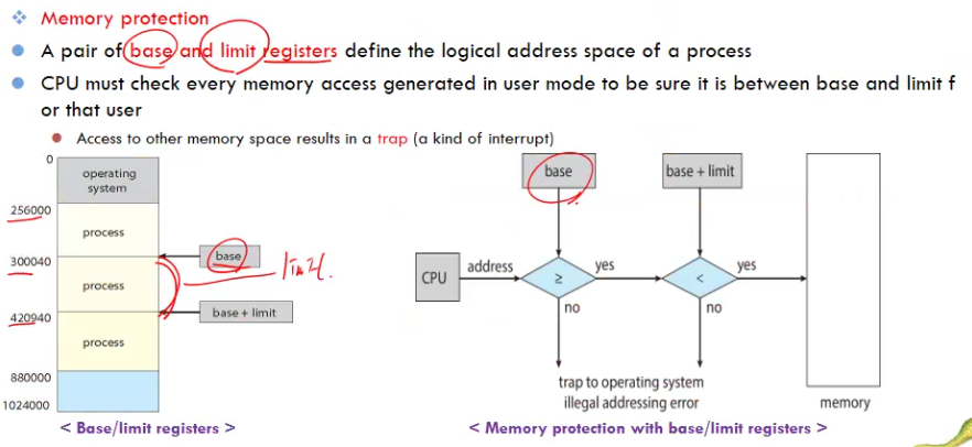 Memory Protection : 여러개의 프로그램이 올라갔을떄 서로의 영역을 침범하지않도록 조정해주는것