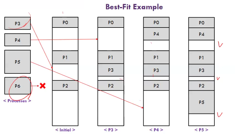 Best-fit : -> 들어갈 프로세스와 가장 크기가 비슷한 메모리부분에 할당해 주는것 ex) 메모리 낭비가 가장 덜한곳에 ..
