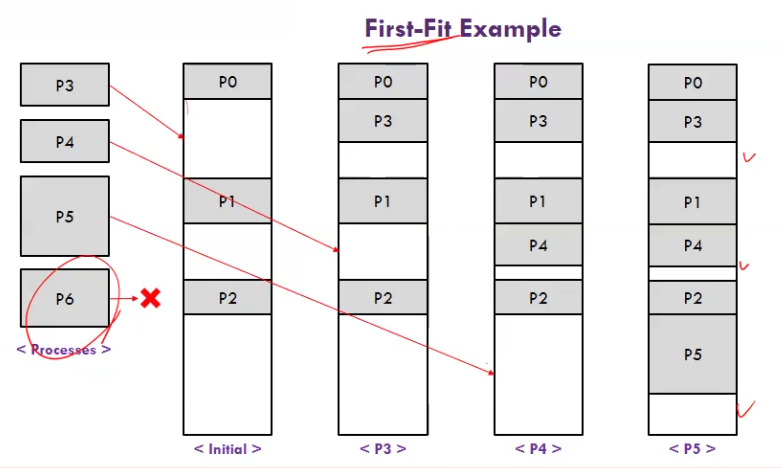 First-fit : 그냥 들어갈수있는 공간에 할당하면됌 / 빨리할당가능 / 'simple'(장점일수도 ..?)