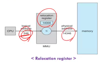 : 프로세스마다 할당이 되어있어서, logical address + relocation register -> physical address
