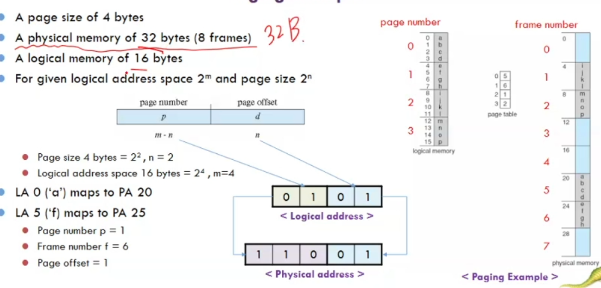 LA 5 ('f') maps to PA 25 -> LA(logical address) 5번을 넣으면 PA(physical address) 25번으로 매핑되야한다는 소리