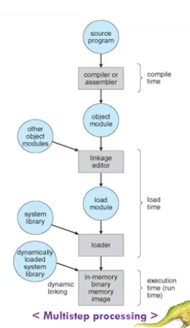 -> Load time과 Execution time의 차이점? : Load time은 한번 프로그램이 올라오면 정해진 메모리위치에 고정. but, 현대 메모리(Execution time)은, 메모리에서의 위치가 실시간으로 바뀜 : 물리주소(physical address)는 프로세스 전, 실시간으로 정해짐 -> 더 효율적이지만, 더 복잡한 하드웨어의 원인이 됨.