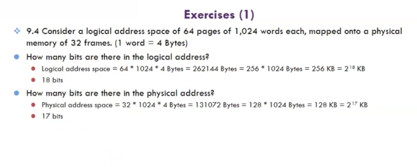 : logical address는 64페이지가 있는데 페이지 하나당 4kb -> 총 256kb