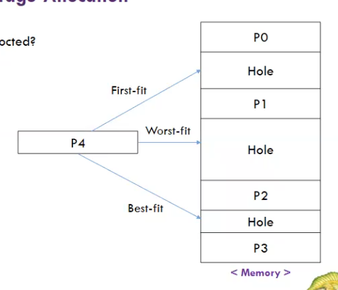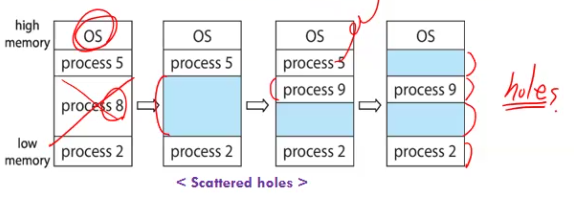 Contiguos memory allocation : 연속적으로 메모리에 올리는 방식 (가장 기본적, 단순) -> but, 메모리에 hole이 생김