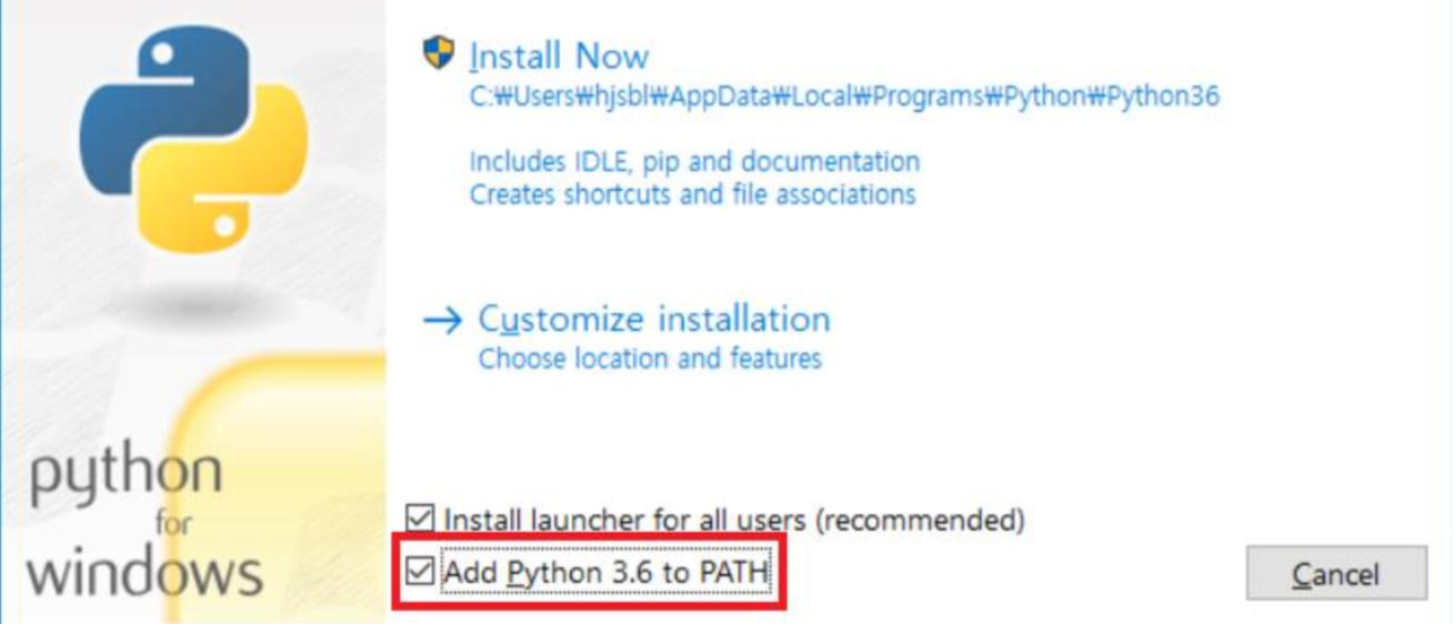 Add Python 3.6 to PATH부분을 체크해주고 넘어간다.
