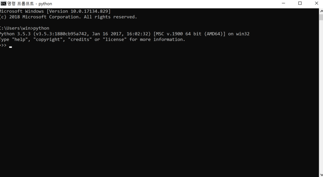 cmd창에서 python을 입력하였을떄, python script 창이 나오면 설치가 정상적으로 된것이다.