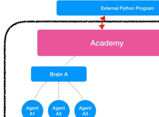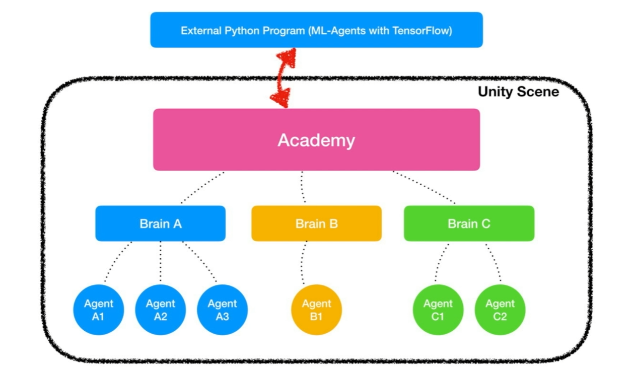 이 구조에서, Unity 내부의 agent 들은 관측된 정보들을 brain과 Academy를 통해서 외부에있는 python program으로 보내고, 외부의 python program은 모델과 관측된 환경에서의 결과값을 다시 유니티 내부로 보내는 구조이다 .