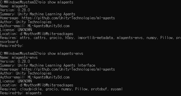 위와 같이 Unity ml-agents Github에서 Python Package 를 다운 받은후, pip에서 아래와 같이 명령어를 입력하게 되면 설치가 완료된다.