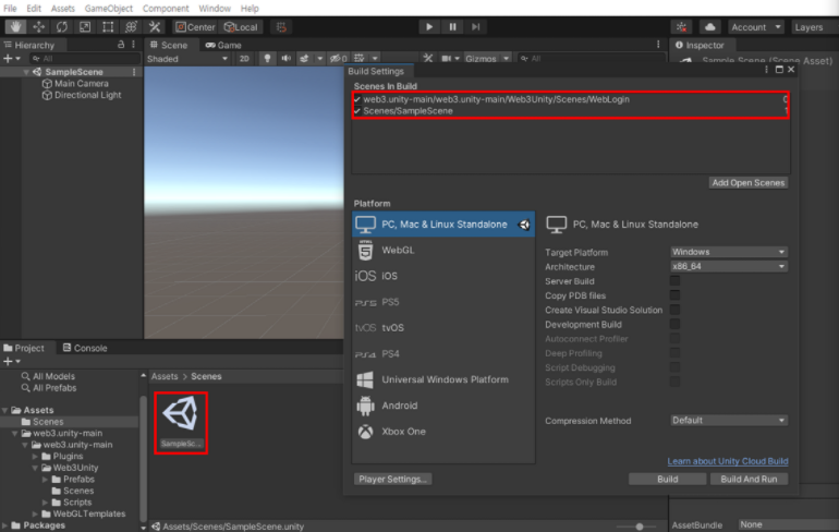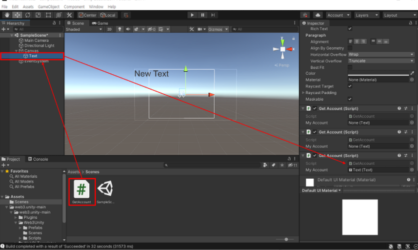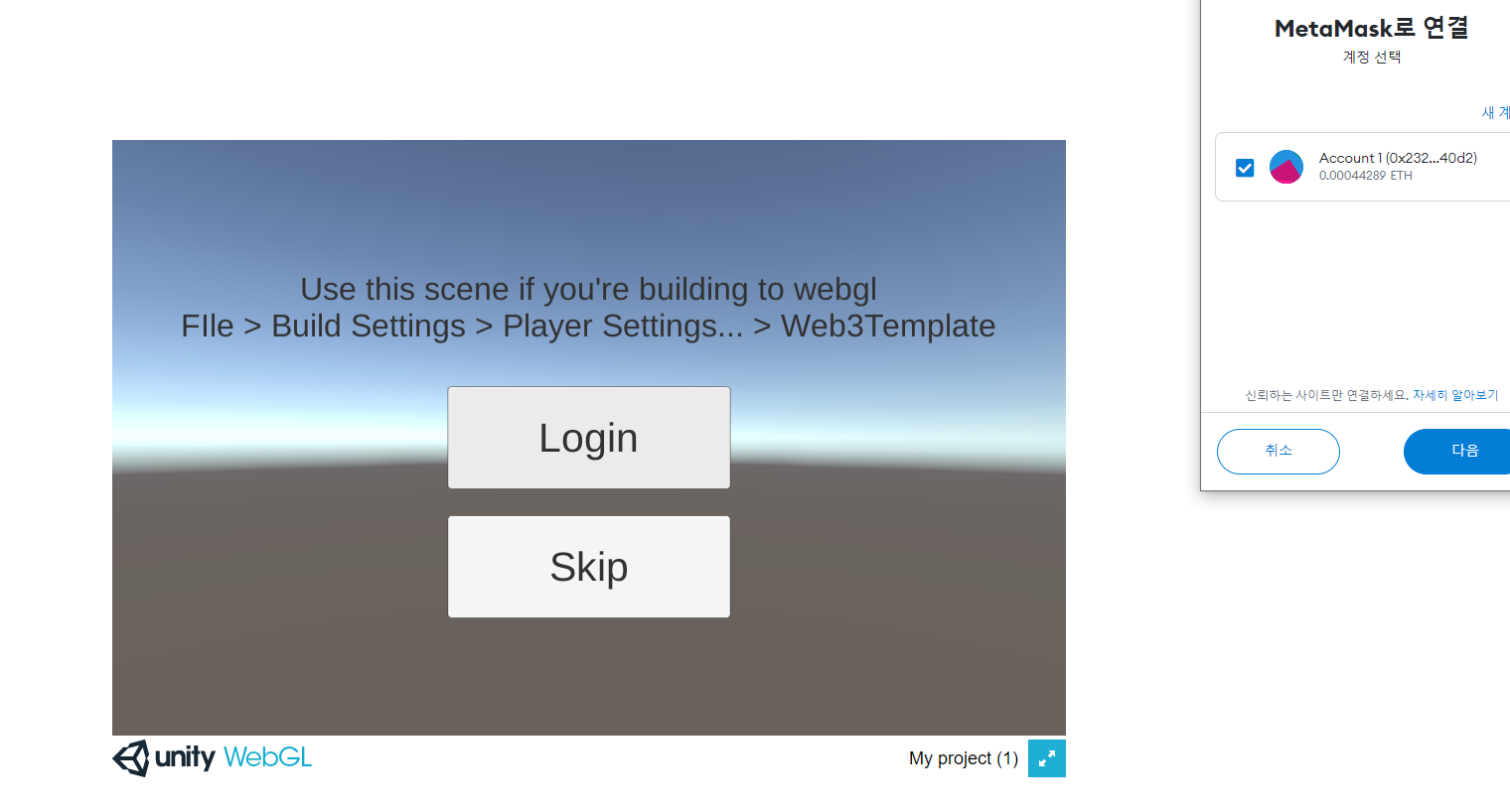 아래와 같이 Metamask 로그인을 완료하였을시 사용자의 지갑주소를 Text 상에 띄워줄수있도록 씬을 더해주고, WebGL 형식으로 플랫폼을 변경한다.