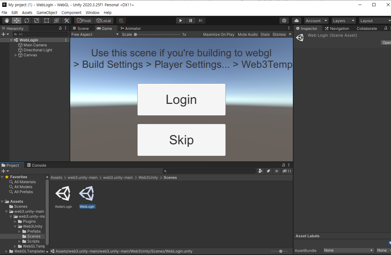 임포트를 완료하였다면 아래와 같이 Assets/_dLabs/Scenes/WebLogin 을 클릭하여 씬을 열어준다.