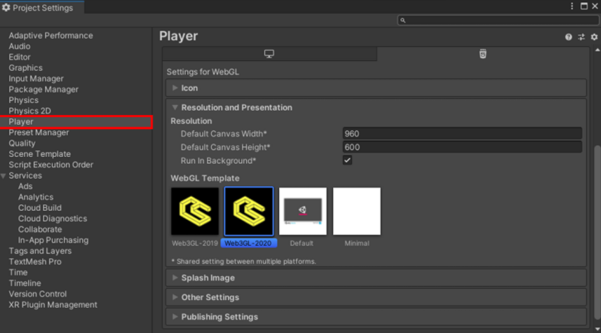 위 작업을 완료하였다면 Player Settings..를 클릭후 WebGL의 Template을 아래와 같이 Web3GL-2020으로 변경해준다.