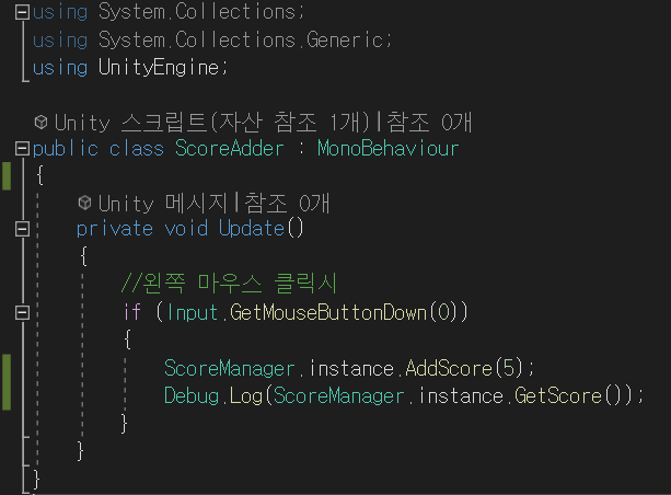 바로 이때 위와 같이 Score에 영향을 미치는 함수들의 Script를 때마다 ScoreManager에 참조시켜서 사용하는것이 아니라, 싱글톤 패턴을 사용하면 된다.