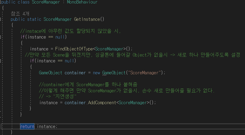 기본적으로 디자인패턴이란, 각 상황에 맞게 여러가지 방향으로 작성할수있다. 위의 경우, 싱글톤을 찾아갈때 아직 Instance에 할당된것이 없다면 Scene상의 모든 GameObject를 뒤져서 ScoreManager를 찾은후,이를 instance에 할당하는 방식이다.
