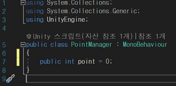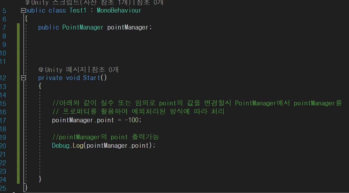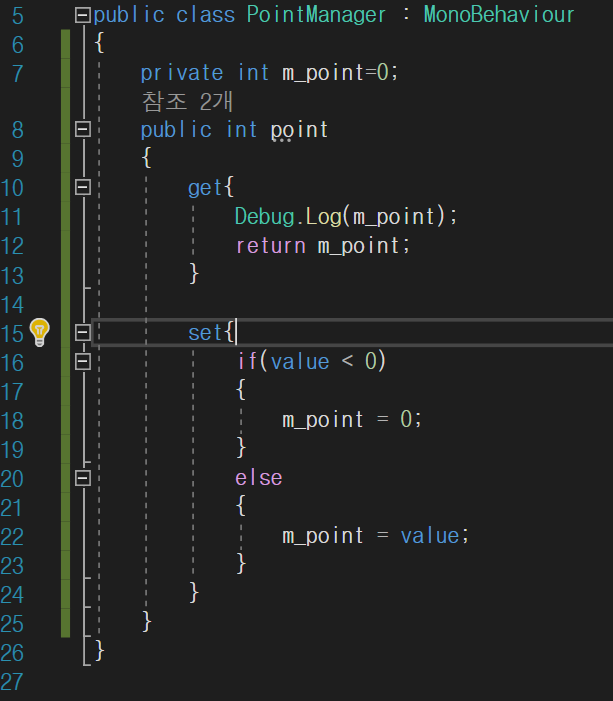 아래와 같이 public int m_point 라는 private 변수를 클래스 내에 하나 만든후, point 변수는 get{},set{} 형태로 참조하거나, 참조하여 값을 적용하려할때 함수와 같은 형태의 조건을 두어 데이터를 관리하도록 하였다.