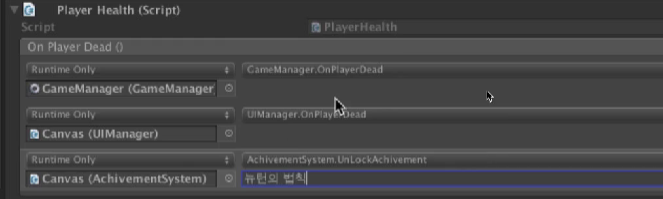 위와 같은 방식의 코드작성을 방지하기 위해 존재하는것이 유니티 이벤트이다.