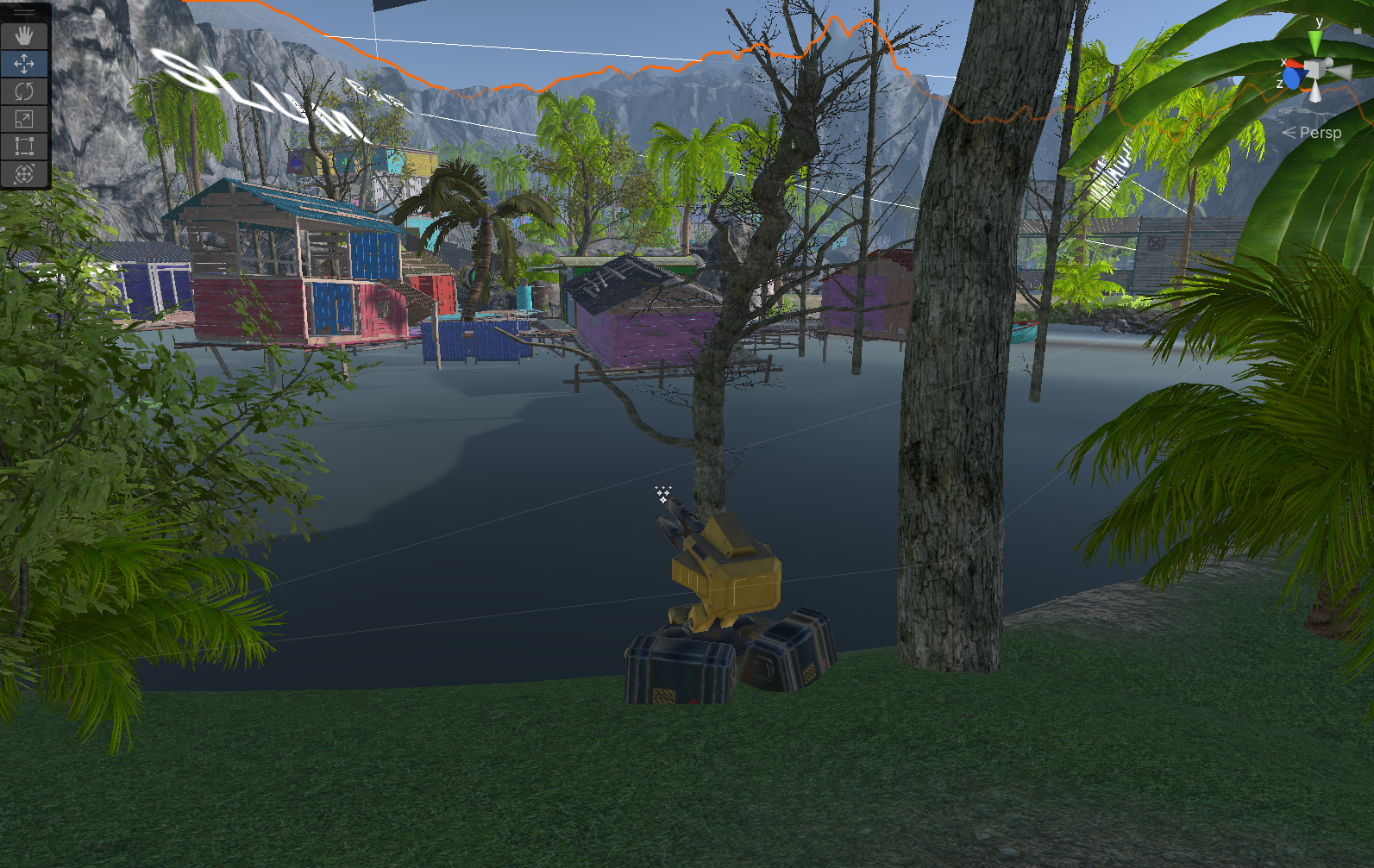 - 맵 곳곳에 배치된 터렛의 일정 스캔범위내에 플레이어가 접근하게되면, 터렛이 플레이어를 향해 포를 조준하며 탄환을 발사한다.