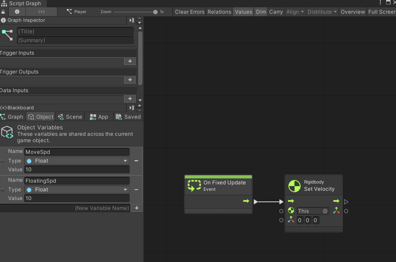 비주얼 스크립팅 구현을 위해서는 기본적으로 New -> Visual Script 혹은 오브젝트 클릭후 컴포넌트에서 add component -> script machine -> new 응 통하여 아래와 같이 스크립팅 창을 생성하여 구현할수 있다.